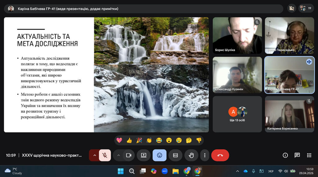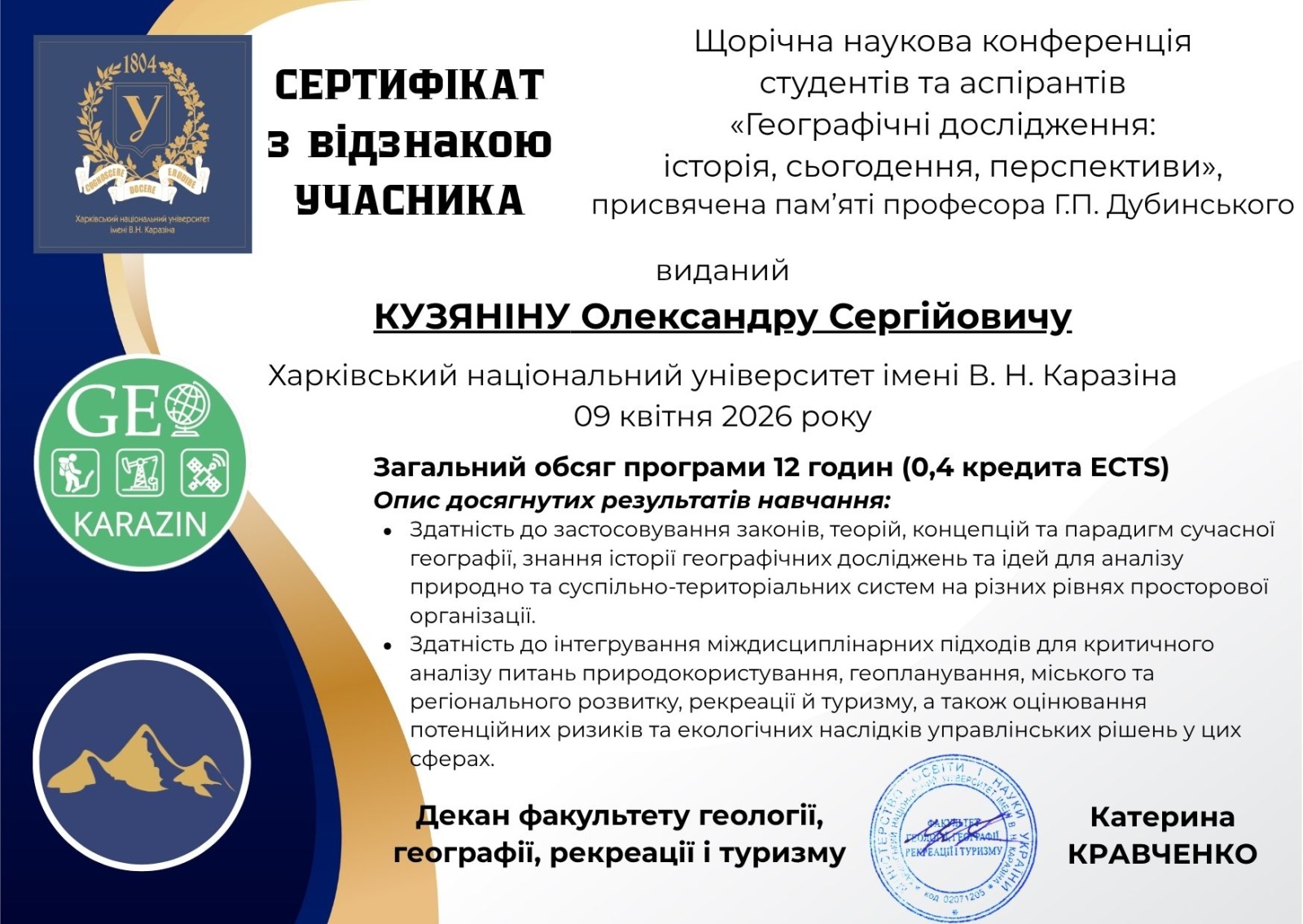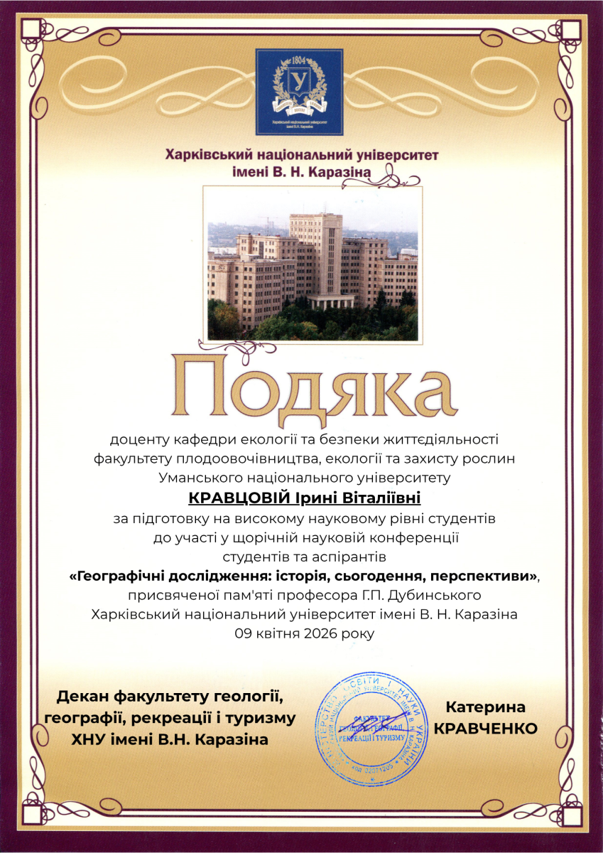 09 квітня 2026 року на кафедрі фізичної географії та картографії факультету геології, географії, рекреації і туризму Харківського національного університету імені В. Н. Каразіна відбувалася ювілейна XXXV щорічна наукова конференція студентів та аспірантів «Географічні дослідження: історія, сьогодення, перспективи», присвяченій пам’яті професора Г. П. Дубинського (https://geo.karazin.ua/news/11-04-26/), у роботі якої взяв участь аспірант другого року підготовки спеціальності 101 «Екологія» Кузянін Олександр Сергійович (науковий керівник – доктор географічних наук, доцент І. В. Кравцова).